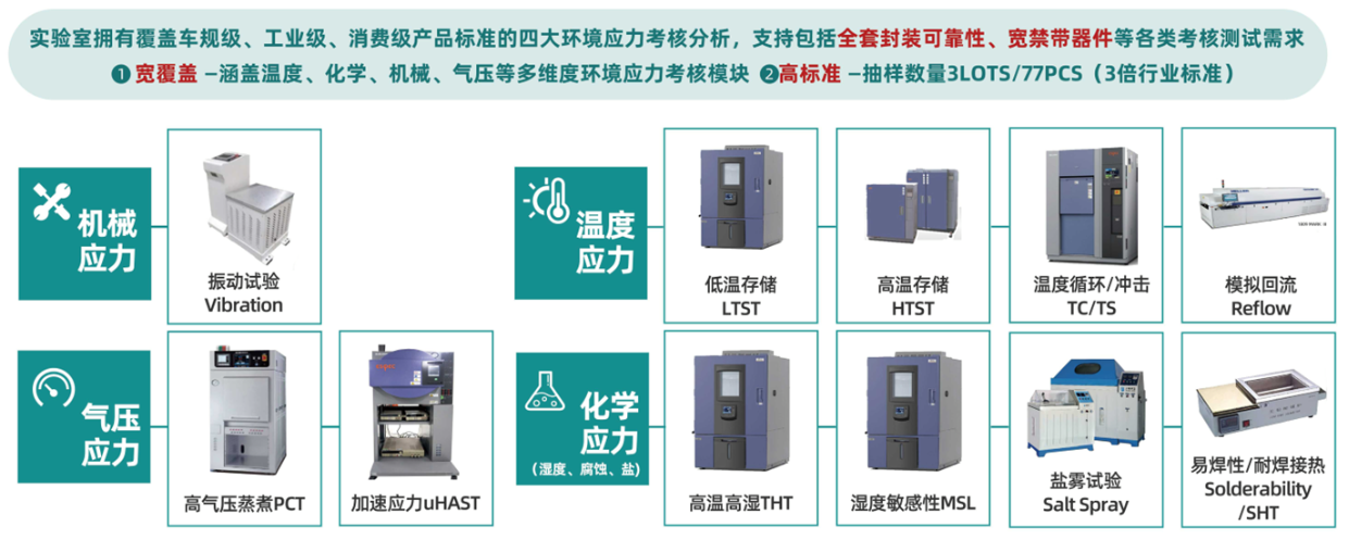 芯朋微电子失效分析与可靠性检测中心,总部(无锡)分部(苏州、上海、青岛、深圳)联动,面积超7000㎡,投资超1.1亿。中心配备百余套考核设备,覆盖环境应力可靠性、电应力可靠性、失效分析、参数测试、芯片快速验证等五大技术功能版块,以全方位助力提升公司产品信赖性与研发能力。中心通过专业实验室CNAS体系认证(ISO/IEC17025),满足车规AEC-Q100/101产品认证的可靠性考核规范。
