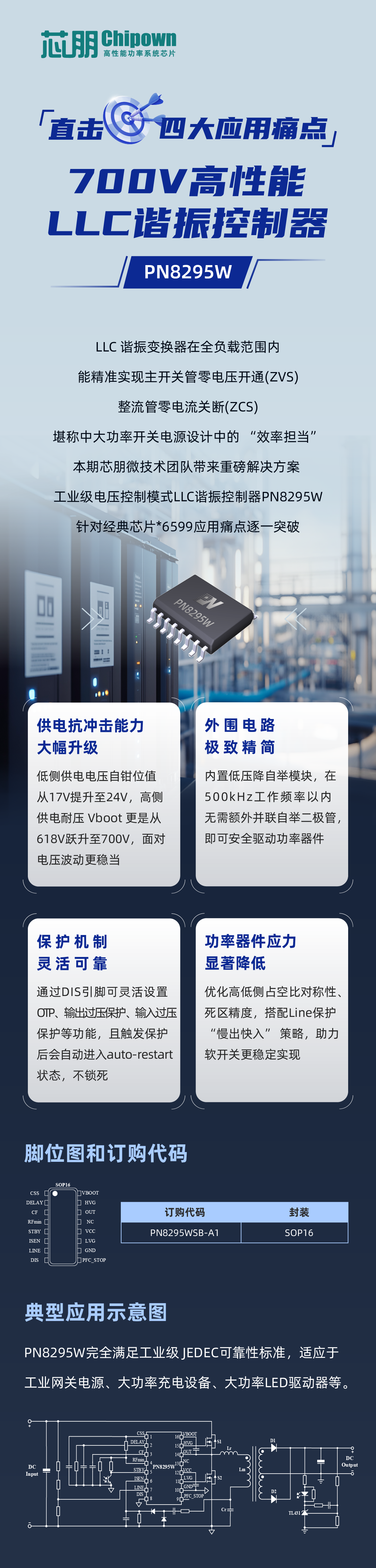 LLC谐振变换器在全负载范围内能精准实现主开关管零电压开通(ZVS)、整流管零电流关断(ZCS)堪称中大功率开关电源设计中的“效率担当。本期芯朋微技术团队带来重磅解决方案工业级电压控制模式LLC谐振控制器PN8295W,针对经典芯片*6599应用痛点逐一突破。