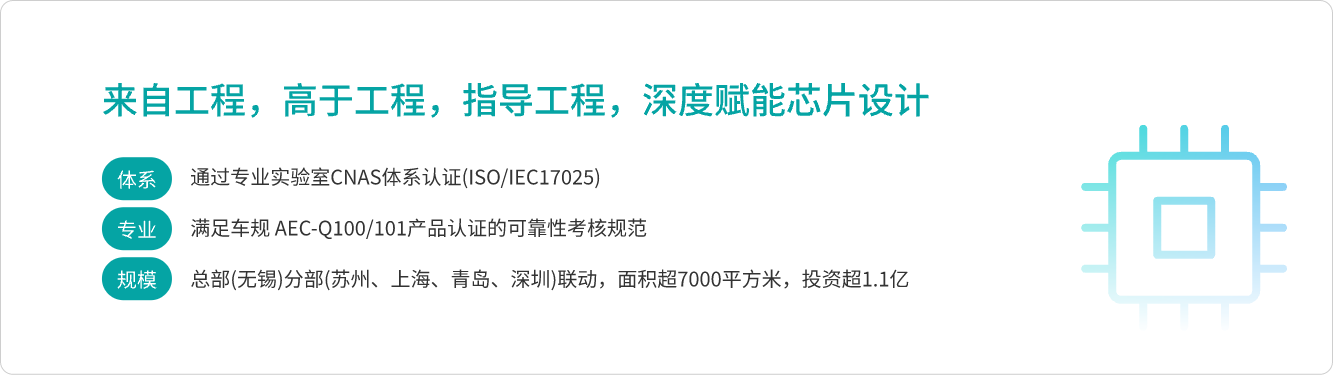 芯朋微电子失效分析与可靠性检测中心,总部(无锡)分部(苏州、上海、青岛、深圳)联动,面积超7000㎡,投资超1.1亿。中心配备百余套考核设备,覆盖环境应力可靠性、电应力可靠性、失效分析、参数测试、芯片快速验证等五大技术功能版块,以全方位助力提升公司产品信赖性与研发能力。中心通过专业实验室CNAS体系认证(ISO/IEC17025),满足车规AEC-Q100/101产品认证的可靠性考核规范。